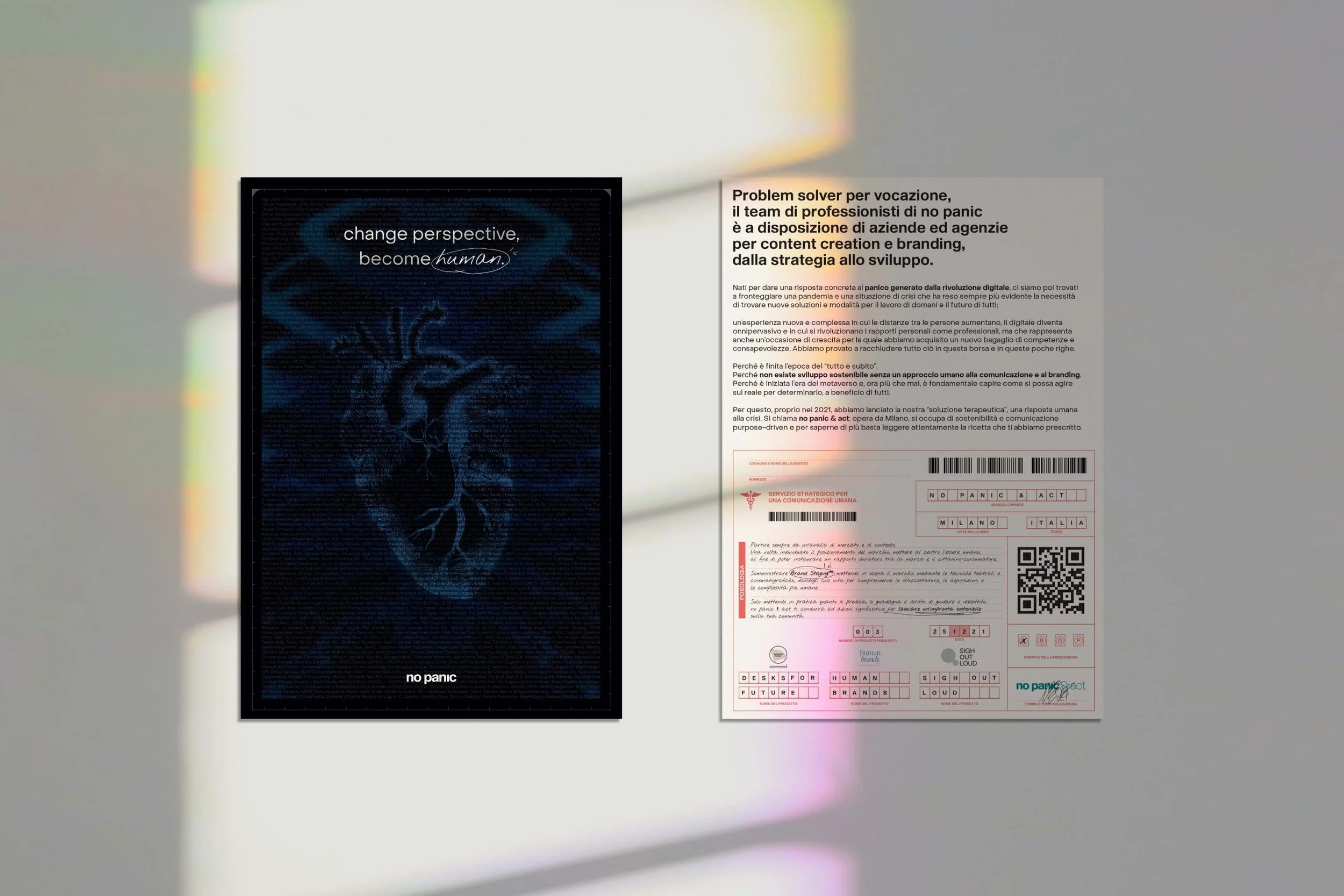 Ed è infatti proprio su questa concezione di umanità di marca, trasparente, onesta e generosa, che negli ultimi mesi abbiamo costruito il posizionamento di no panic & act, la nostra branch milanese. Sono le basi sulle quali abbiamo lanciato il nostro podcast e sono le ragioni che muovono la ragion d’essere di ogni nostra attività. Come vedete non ci limitiamo a guidare le aziende a ristrutturare la propria comunicazione in ottica purpose driven, ma sono regole che applichiamo a noi stessi in primis. Non a caso abbiamo ristrutturato il nostro workflow per aderire al network di Desks For Future, sostenendo il lavoro agile in ottica sostenibile.