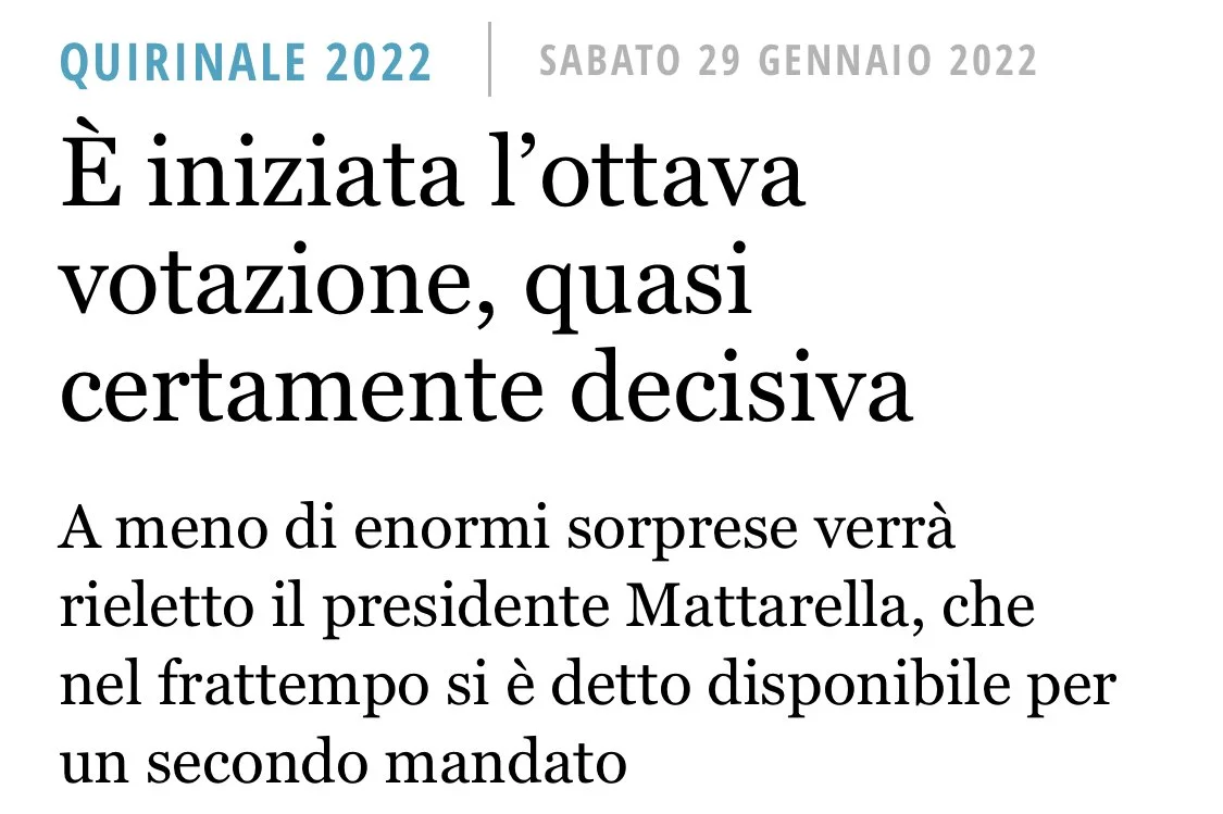 e poi, ricordo male io o il voto del presidente della repubblica è segreto? e ripeto, non ho dubbi che venga eletto, ormai. ma metti caso - metti caso! - che forse forse della lega non c’è poi così tanto da fidarsi, come di tanti franchi tiratori, ma tu con che faccia poi alle 21 lo spieghi ai cittadini che ti sei fatto infinocchiare come un brocco? ma poi, che valore aggiunto mi dà questa comunicazione? non bastava volgere tutto al condizionale: “la rielezione del presidente mattarella sarebbe un grande successo per il paese”? non per niente ilpost, che da questo punto dì vista non smetterò mai di lodare, la stessa notizia la annuncia così: