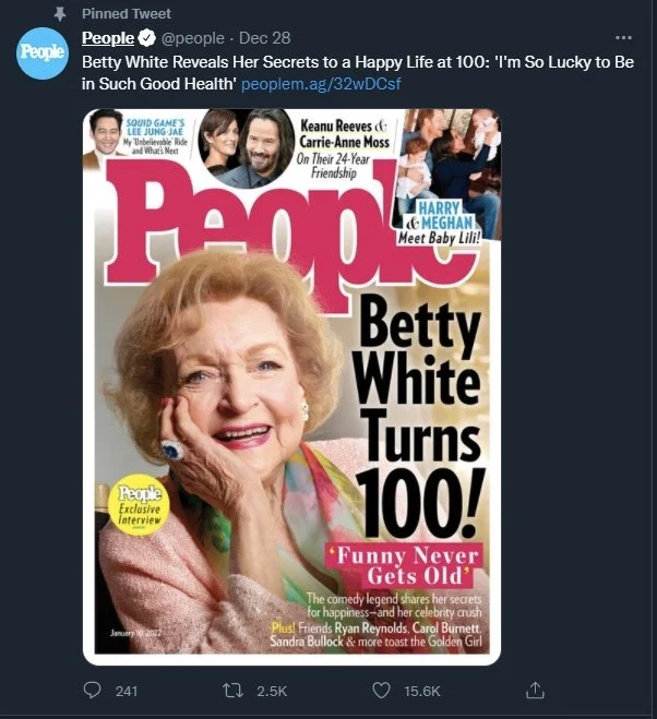 si tratta di un trend preso in esame da francesco costa nel suo morning e che già aveva colto la mia attenzione il 3 gennaio, quando raccontava la vicenda dell’attrice betty white. avrebbe infatti compiuto cento anni questo mese, la celebre artista americana, ma già a dicembre si era cominciato a celebrarne l’anniversario in una sorta di gara mediatica per battere la concorrenza sul tempo; e così dozzine di rotocalchi americani e internazionali già a dicembre le avevano dedicato copertine e articoli entusiasti che ne ripercorrevano la carriera. peccato che poi, il 31 dicembre, betty white è morta. ma morta morta e quindi non ha raggiunto i cent’anni, lasciandosi alle spalle uno stuolo di ottimistiche quanto patetiche celebrazioni mia consumate.