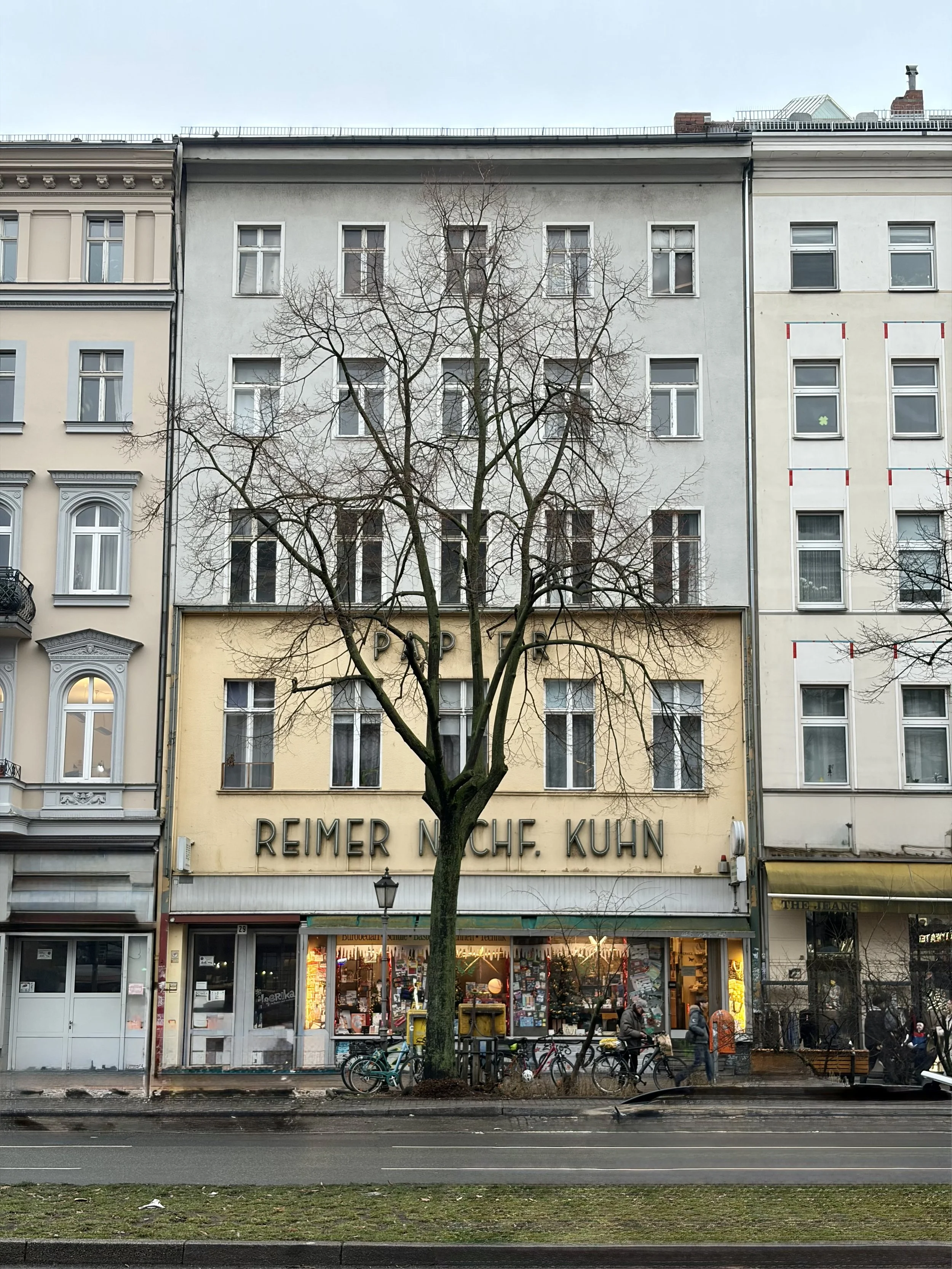 L’insegna dice Reimer Nachf. Kuhn (laddove Nachf. sta per Nachfolger, erede, quindi quello che gli inglesi definirebbero “& Sons”), ma oggi si chiama Büro Service Müller e con questo Sans-Serif meraviglioso occupa l’intera facciata di un’anonima palazzina di Berlino Ovest. Sopra la fila di finestre al primo piano troneggia la scritta Papier, sotto il nome dello storico proprietario. Sembrerebbero tra l’altro essersi comprati metà palazzo, perché al di sopra cambia pure il colore della facciata.