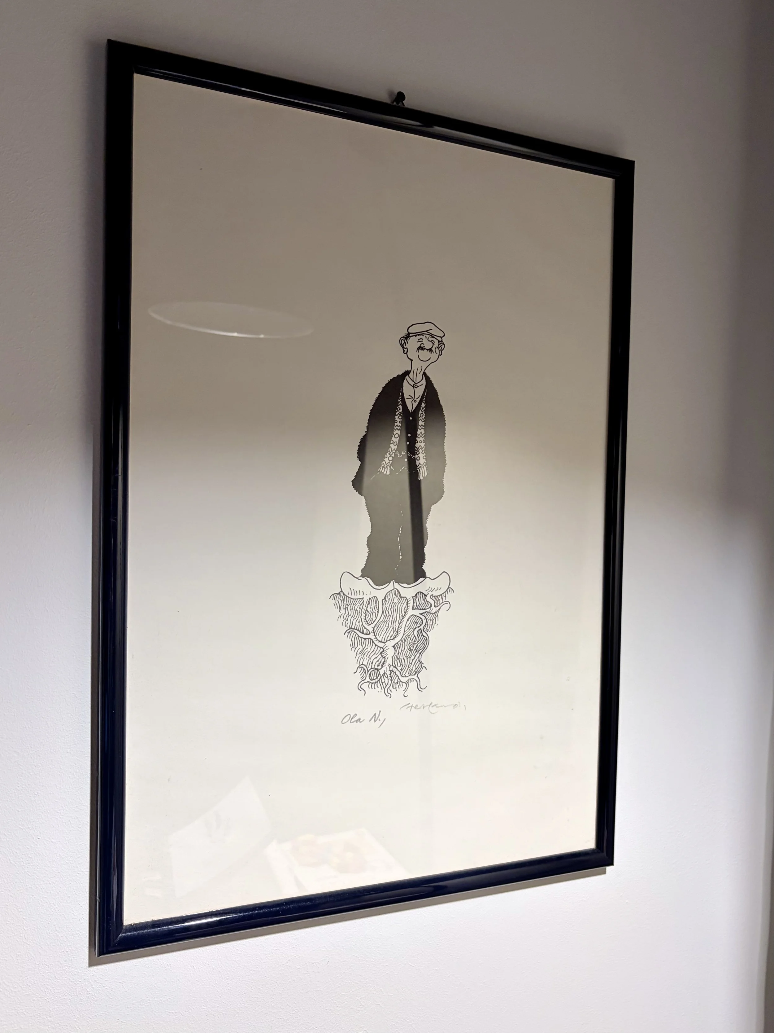 Una in particolare mi catturò al primo sguardo: un anziano sdrucito in abiti da pescatore, con ai piedi le tresko (i tradizionali zoccoli di legno che generalmente colleghiamo ai soli olandesi). Nel disegno, dalla suola di legno nascono spesse radici che si immergono nella terra, ancorando il vecchio al suolo come un albero.